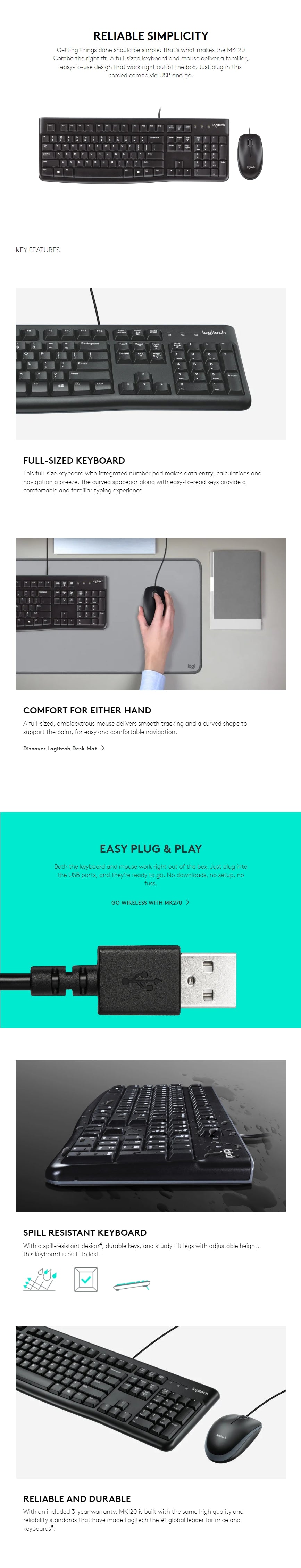 Logitech MK120 Spill-Resistant 10-Key Number Pad USB Wired Keyboard and Mouse Combo