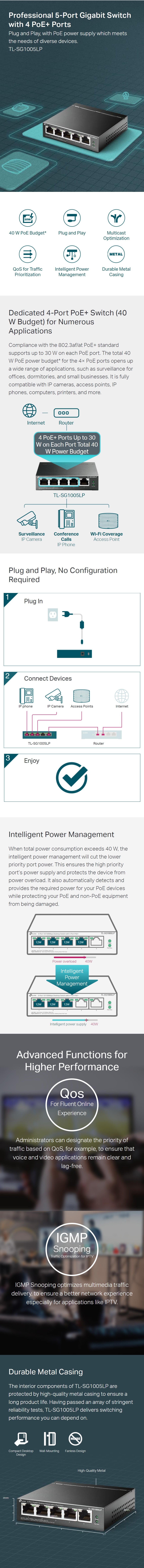 TP-Link TL-SG1005LP 5-Port 10/100/1000Mbps Gigabit Desktop Switch With 4-Port PoE+ Network